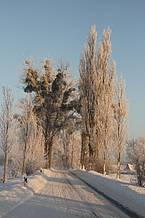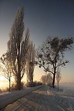Wie Taktstriche wirken die Bäume der Pappelallee aus der Ferne. Schlanke Pyramidenpappeln, nicht von ungefähr als die Zypressen des Nordens bezeichnet, und dazwischen Hybridpappeln erzielen eine ungewöhnliche Raumwirkung, die besonders aus der Ferne besonders eindrucksvoll ist. Zwischen den Pappeln wachsen vor allem Wildrosen, eingriffeliger Weißdorn (Crataegus monogyna Jacq.) und Schlehen (Prunus spinosa), die im Frühjahr und Herbst durch ihre Blüten und Früchte die Strenge der Bäume auflockern. In den Kronen der Hybridpappeln wachsen unzählige Misteln, die besonders im Winter ein interessantes Bild der Gehölze bewirken. Sie bieten aber auch bei Sturm entsprechende Angriffsflächen für den Wind, was oft dazu führt, dass ganze Äste abbrechen. Entsprechend "verstümmelt" sehen daher auch die meisten der verbliebenen Hybridpappeln aus. Ein Teil wurde aus Verkehrssicherungsgründen gefällt und durch Nachpflanzung von Pyramidenpappeln im Zuge der Strassenerneuerung 2005 ersetzt. Dadurch konnte das Gesamtbild der Allee deutlich aufgewertet werden. Ursprünglich befand sich an Stelle der Strasse nur ein einfacher Sandweg., der einst von Birken gesäumt worden sein soll. Erst mit dem Bau der Betondecke zu DDR-Zeiten wurde die Strasse zur Hauptverbindung zum Dorf, von der Landesstrasse aus Menz oder Großwoltersdorf kommend. Bis dahin wurden die Buchen- und die Weißbuchen-Ulmenallee als Hauptverbindungswege genutzt, auch wenn es heute nur schwer vorstellbar ist, dass dort einmal Busse fahren konnten.