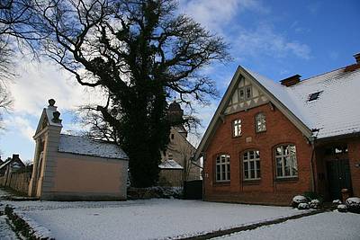 Ehemaliges Küster- und Schulhaus, Erbbegräbnis und ca. 500-jährige Eiche (Foto: U. Blümel 2010)